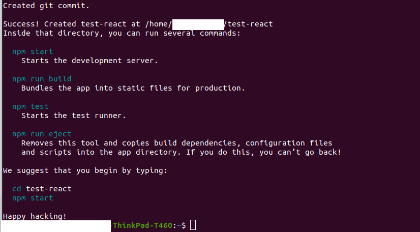 프로젝트 폴더가 완성되고 난 뒤 마지막 2줄을 보면 우리가 만든 프로젝트 폴더로 이동한 다음 npm start를 입력해주면 된다고한다.
