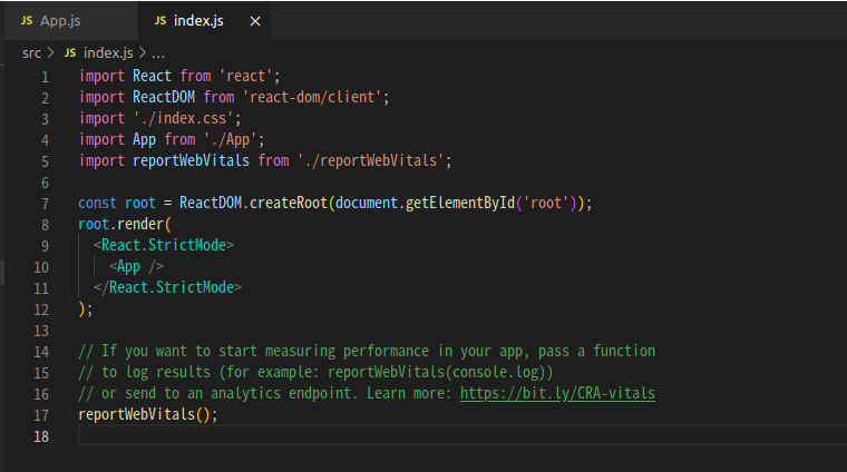 index.js 파일을 열어보니 위에서 본 App.js 를 import하고 render? 라는 것을 사용하고 있다.