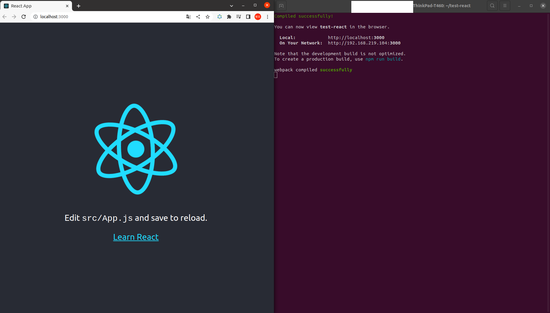 오... 뭔지 모르겠는데 터미널에는 "Compiled successfully!" 라는 문구가 나오고 화면에 React 문양이 빙글빙글 돌고 있는 것으로 보아 실행에 성공한거 같다.